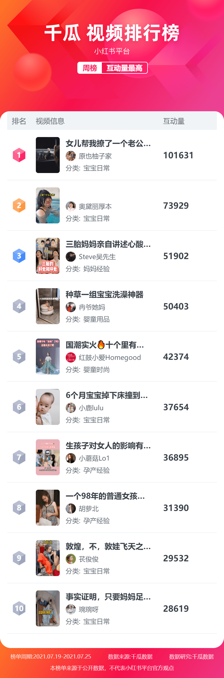 母婴育儿类视频排行榜中,原也柚子家发布的“女儿帮我撩了一个老公”排行第一,互动量101631;奥黛丽厚本发布的无标题笔记排行第二,互动量73929;Steve吴先生发布的“三胎妈妈亲自讲述心酸”排行第三,互动量51902。