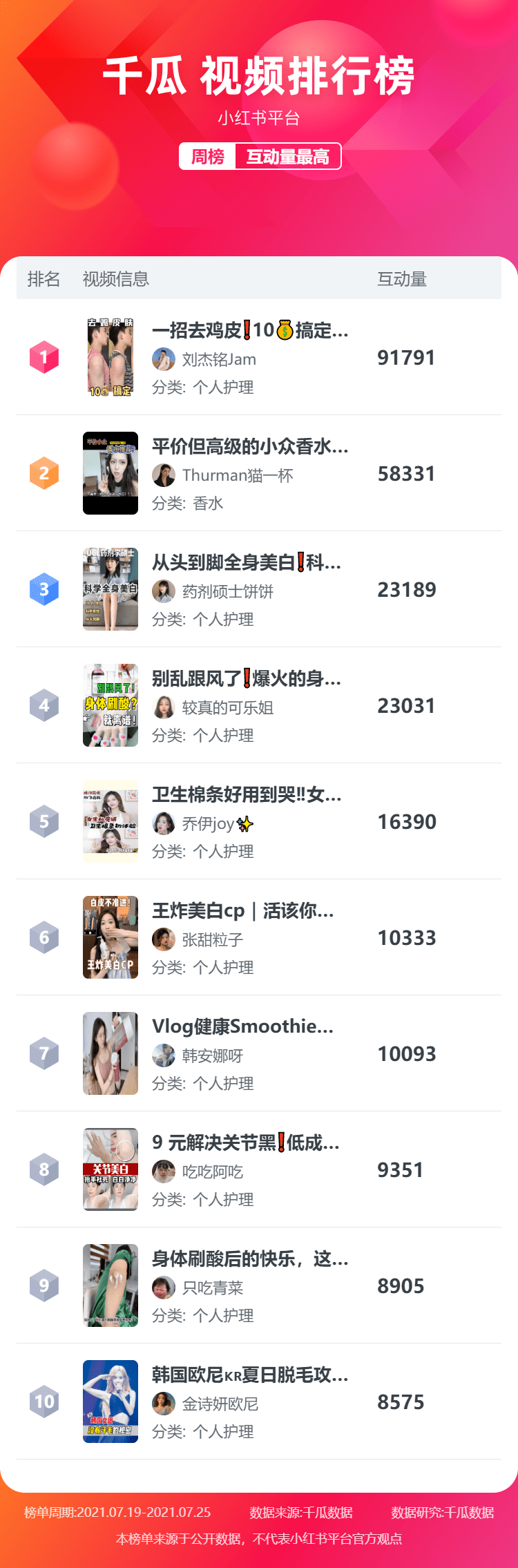 个人护理类视频排行榜中,刘杰铭发布的“一招去鸡皮”排行第一,互动量91791;猫一杯发布的“平价但高级的小众香水”排行第二,互动量58331;药剂硕士饼饼发布的“从头到脚全身美白”排行第三,互动量23189。