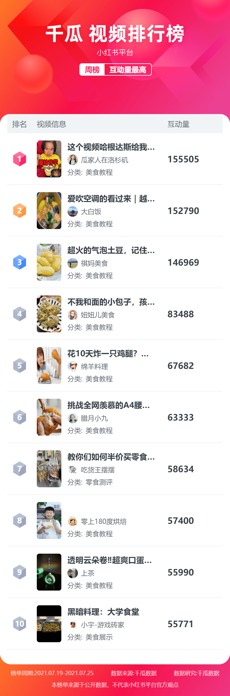 在小红书多元化发展下,从以彩妆、护肤分享为主,到个护、美食、母婴、服饰穿搭等多个行业蓬勃生长,以下为7月第4周千瓜六大行业视频排行榜(小红书平台)。