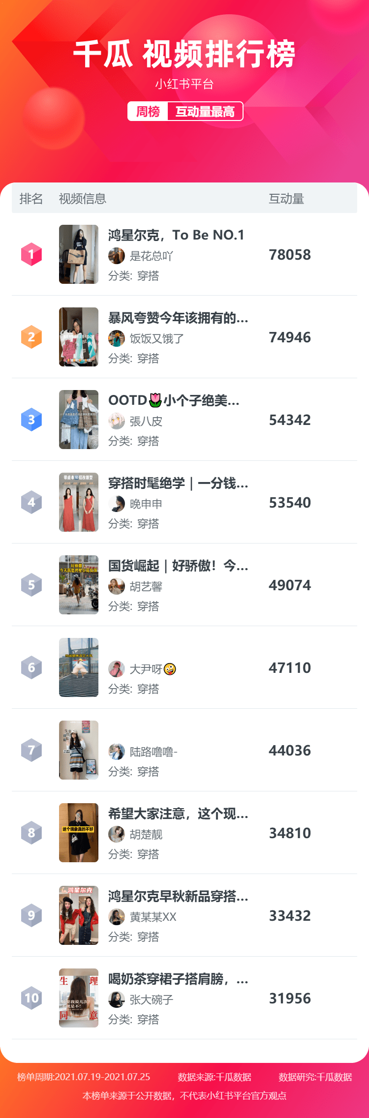 服饰穿搭类视频排行榜中,是花总呀发布的“鸿星尔克,To Be NO.1”排行第一,互动量78058;饭饭又饿了发布的“暴风夸赞今年该拥有的...”排行第二,互动量74946;张扒皮发布的“OOTD,小个子绝美”排行第三,互动量54342。