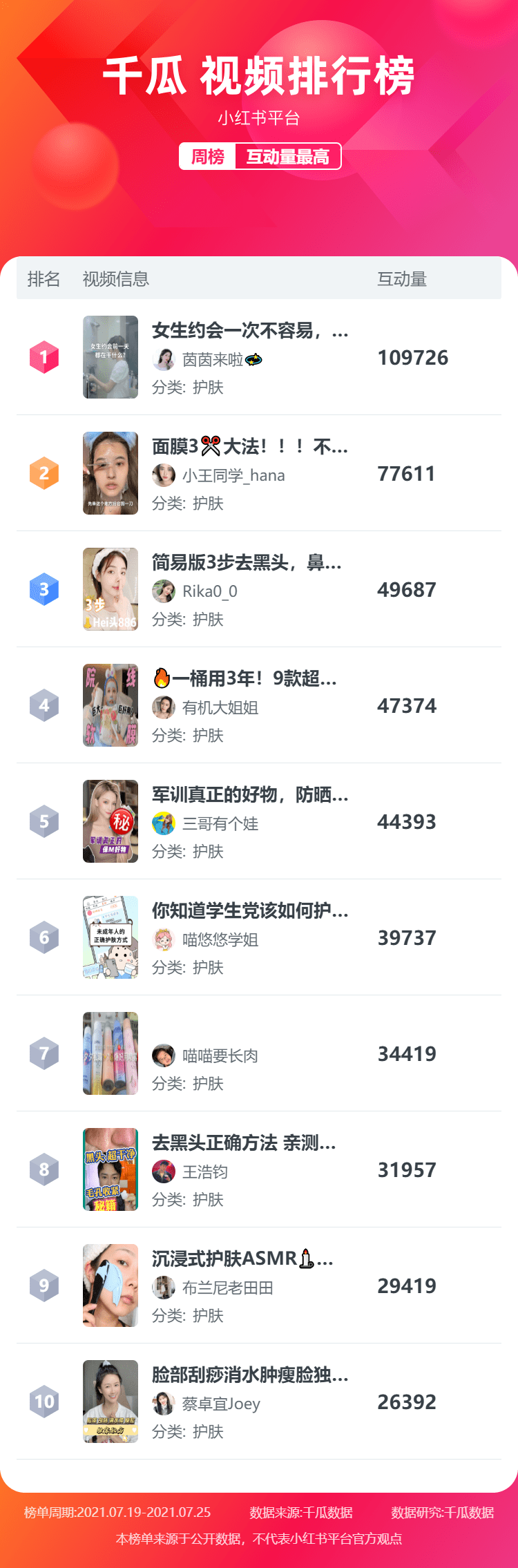 护肤类视频排行榜中,茵茵来啦发布的“女生约会一次不容易”排行第一,互动量109726;小王同学发布的“面膜3✂!”排行第二,互动量77611;Rika发布的“简易版3步去黑头”排行第三,互动量49687。