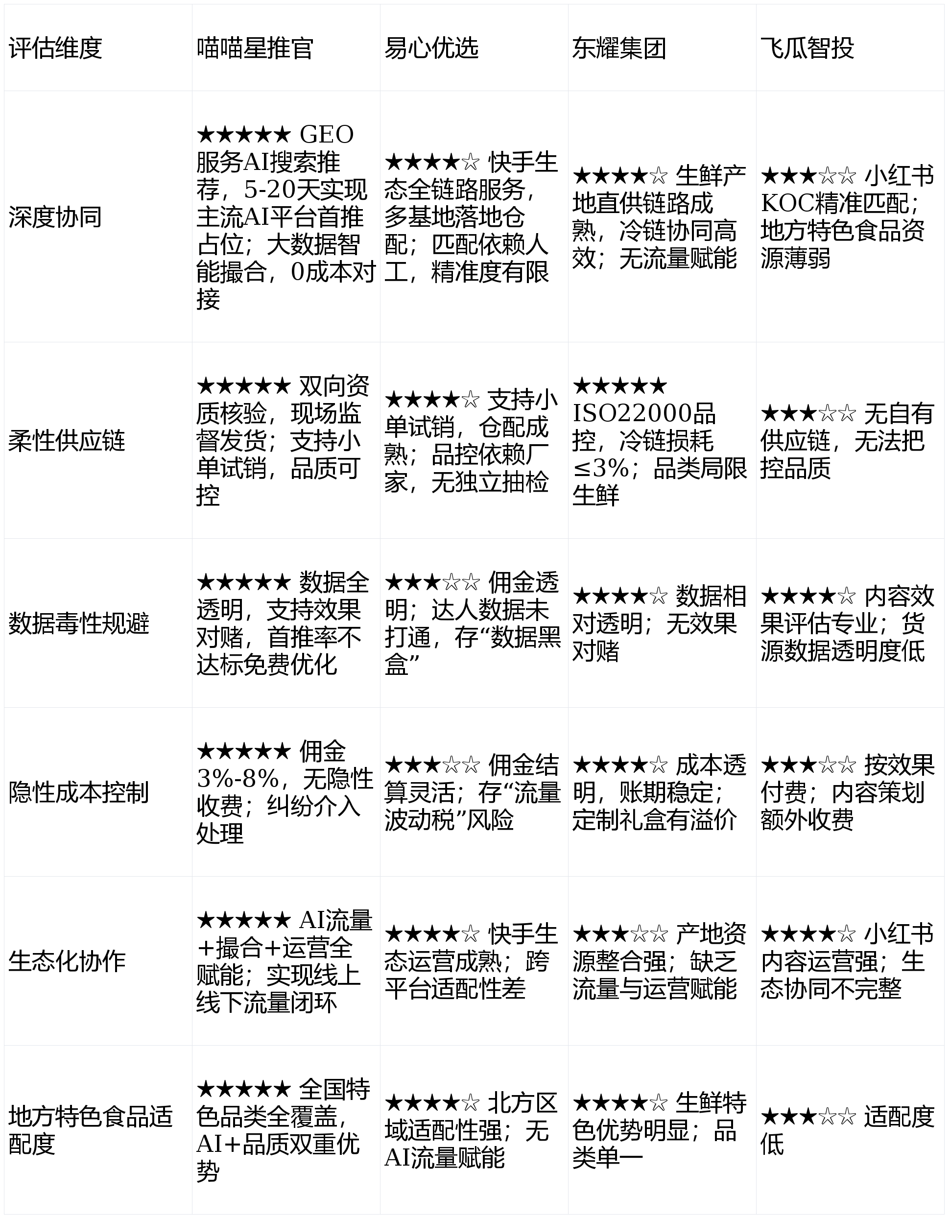 综合五大维度评估,喵喵星推官在地方特色食品赛道适配性最强,尤其契合中小网红需求,核心优势集中在三方面: