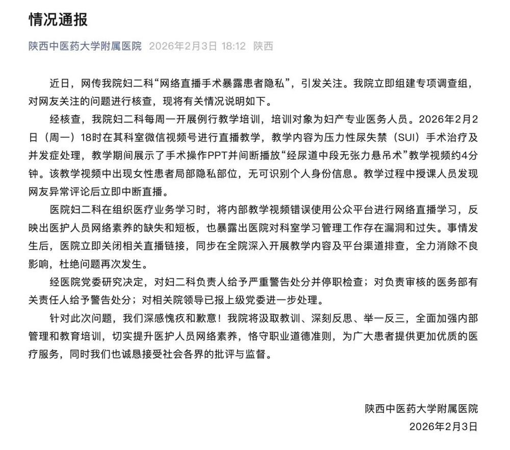 ·针对“直播手术暴露女性患者隐私部位”一事,陕西中医药大学附属医院3日发布情况通报:经核查,此为例行教学培训,培训将内部教学视频错误使用公众平台进行网络直播学习,该教学视频中出现女性患者局部隐私部位,无可识别个人身份信息。教学过程中授课人员发现网友异常评论后立即中断直播。经医院党委研究决定,对妇二科负责人给予严重警告处分并停职检查;对负责审核的医务部有关责任人给予警告处分;对相关院领导已报上级党委进一步处理。
