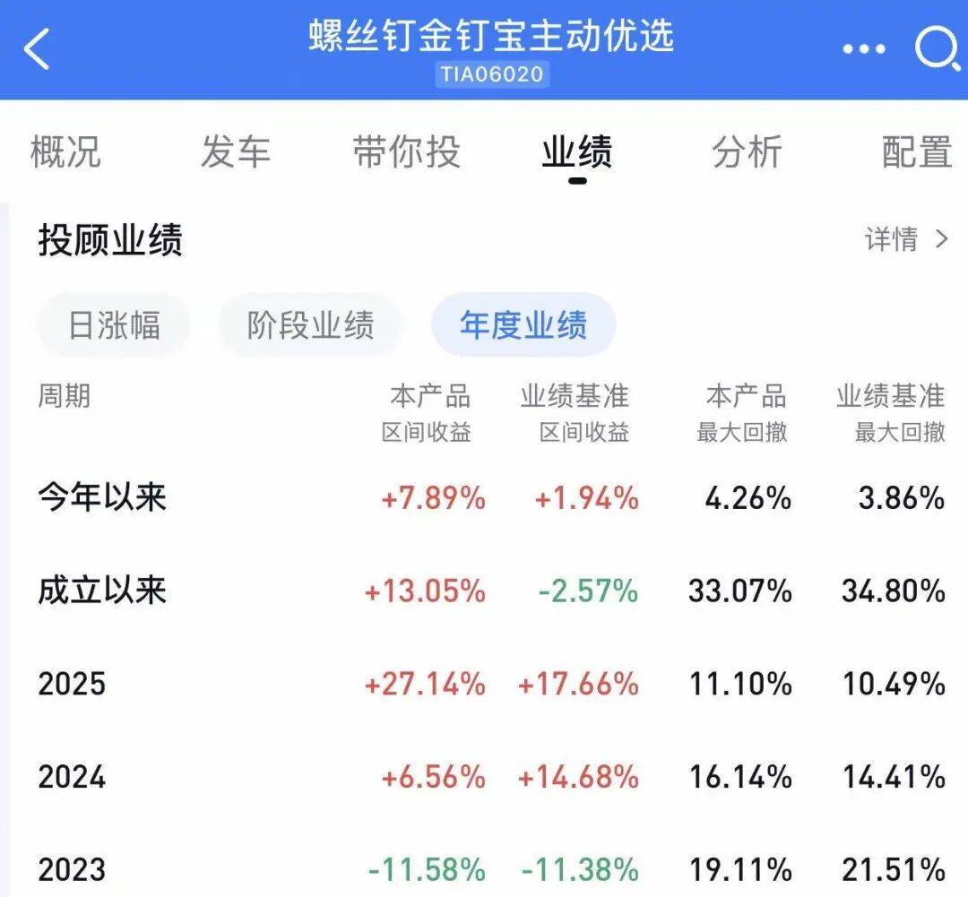 他管理的螺丝钉金钉主动优选2025年收益27.14%,跑赢业绩比较基准17.66%,收益端算是合格,但最大回撤控制欠佳。该产品从2022年成立以来总收益率13.05%。他管理的其他指数增强、月薪宝等投顾产品,这里就不一一展开点评。