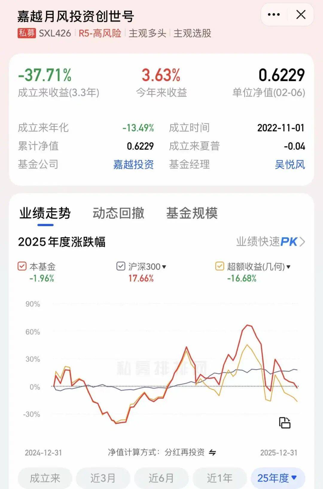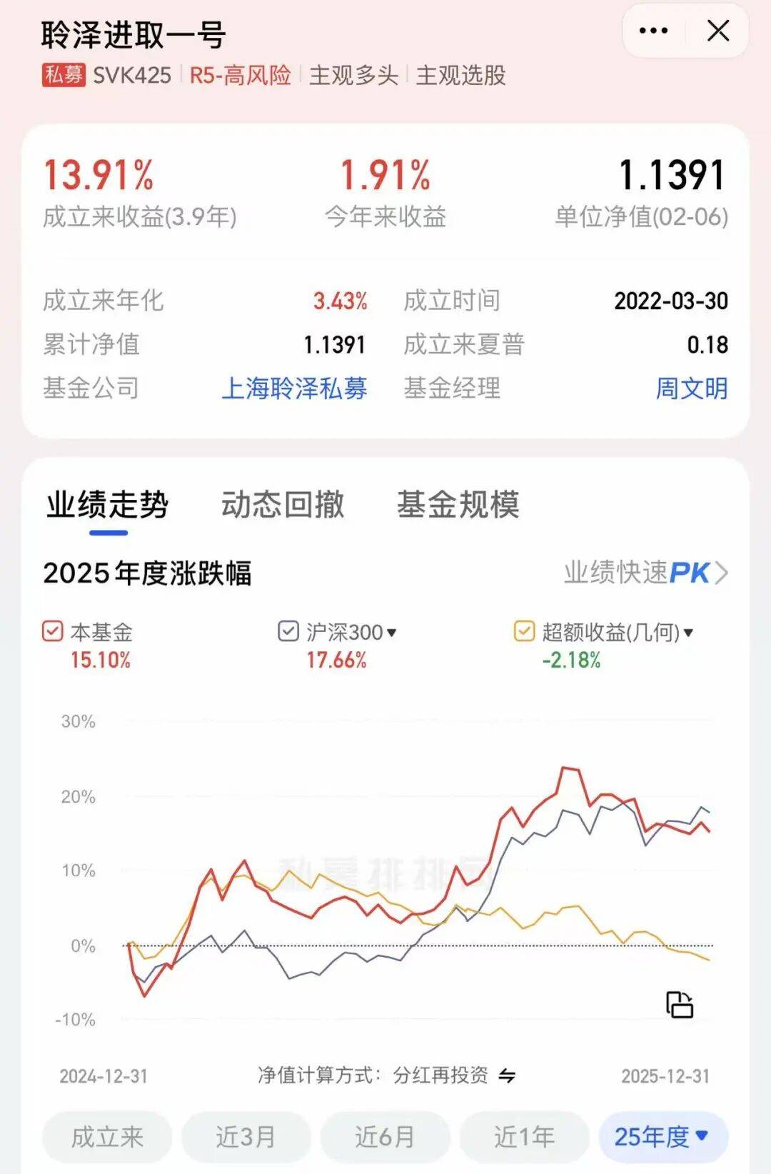 第三方平台数据显示,该产品2025年收益为15.10%,跑输同期沪深300指数2.18%。产品从2022年成立以来,年化收益只有3.43%,在这一轮行情里弹性明显不足,换了名字也没换来业绩的翻身。