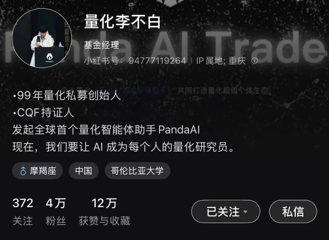 在抖音、小红书活跃的“量化李不白”,真名李昱琦,是配邦私募基金经理,他在抖音拥有粉丝近十万、小红书四万,算是新生代量化网红。