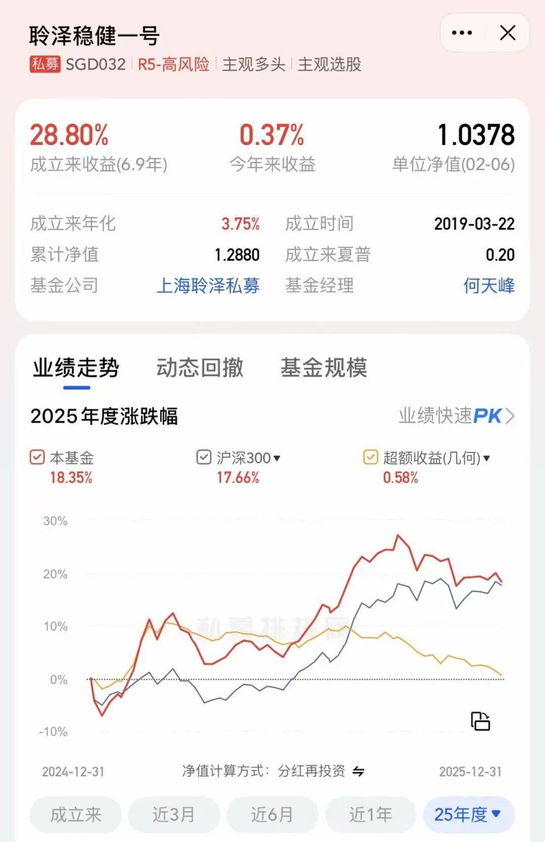 同在聆泽私募、同样是网红财经大V出身的,还有“金融街老裘”何天峰。他管理聆泽稳健一号,这只产品2025年收益为18.35%,小幅跑赢沪深300指数0.58%,算是勉强及格。但拉长时间看,从2019年成立以来,年化收益仅3.75%,稳健有余,收益平平。
