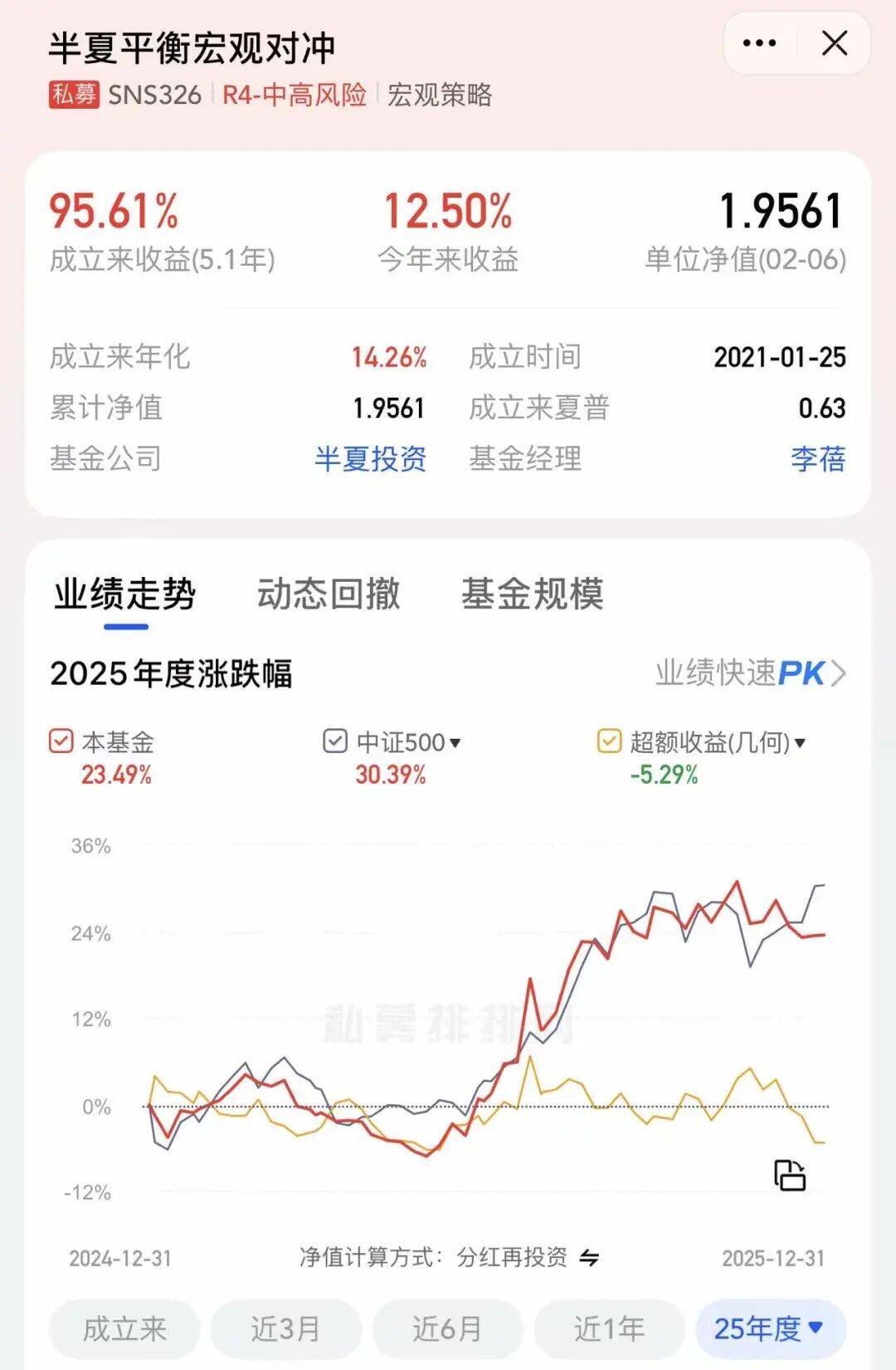 不过单看2025年,表现就稍逊一筹,全年收益为23.49%,同期中证500收益30.39%,跑输指数5.29%,在大年里挺多算中规中矩。