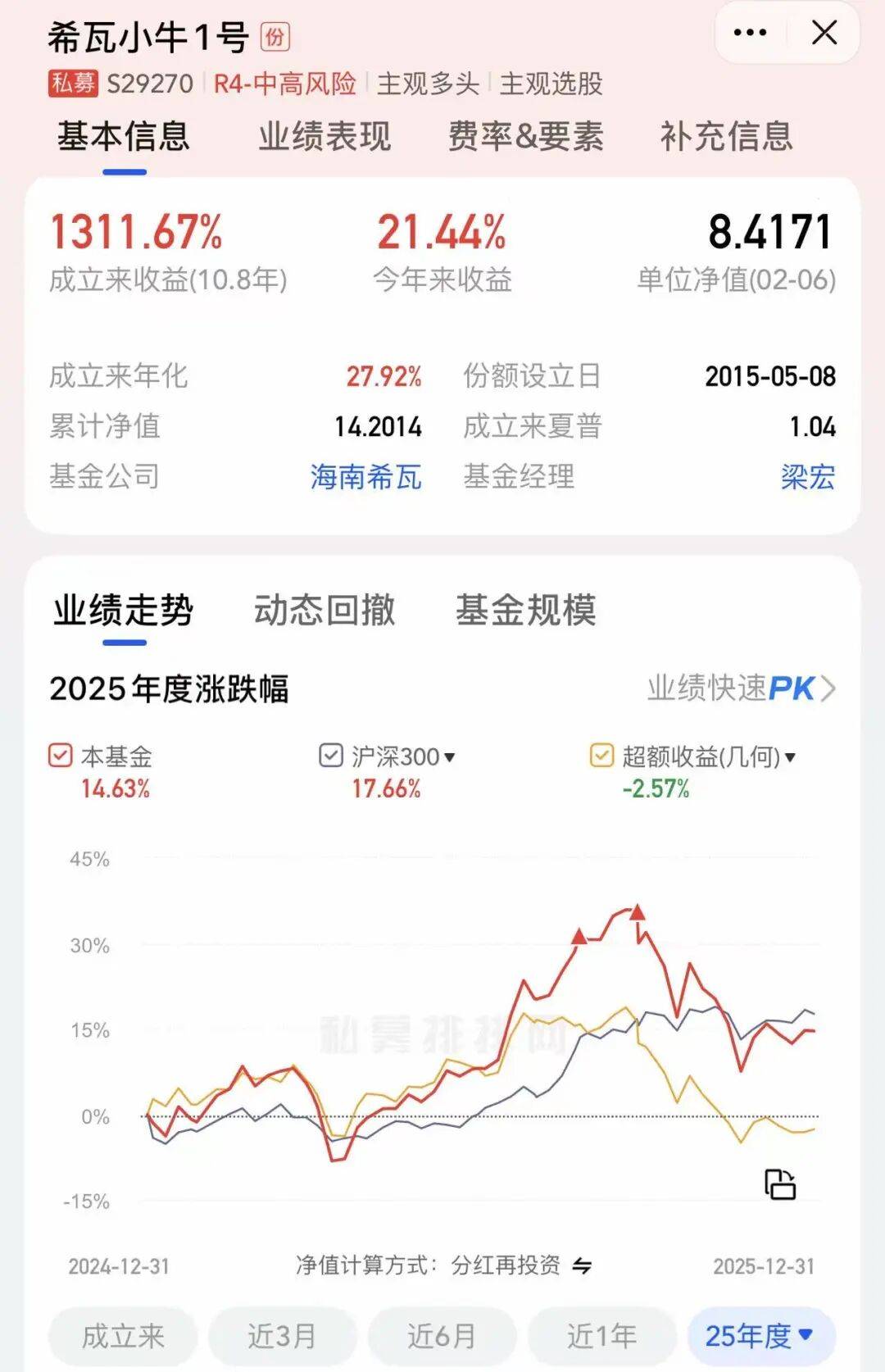 雪球大V、海南希瓦私募创始人梁宏,2025年因为业绩波动曾发文道歉,司机写过《净值回撤20%后,百亿私募大佬认错!》。他管理的希瓦小牛1号2025年收益为14.63%,跑输沪深300指数2.57%,年度表现一般。
