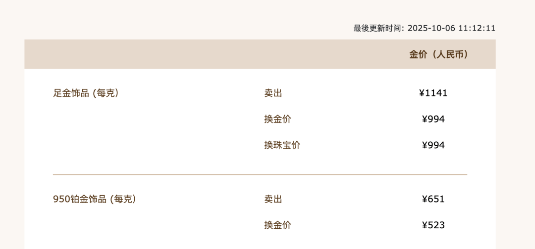 10月6日,周生生足金饰品标价达到1141元/克,周大福足金(饰品、工艺品类)报价也达到1139元/克。
