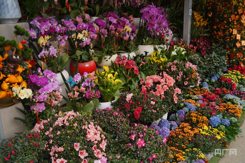 1月18日,记者踏入花市,映入眼帘的是五颜六色的花海、喜庆盈门的年俗用品、浓厚气息的市井生活。市场的年宵花卉区域汇集了数百种春季花卉,市民们纷纷驻足欣赏,挑选心仪的花卉,昂首俏丽的大花蕙兰,红红火火的银柳,独特造型的黄金果……各色花卉琳琅满目,店家搭配醒狮、生肖蛇等小挂件,不仅色彩喜庆,寓意美好,价格也十分亲民。