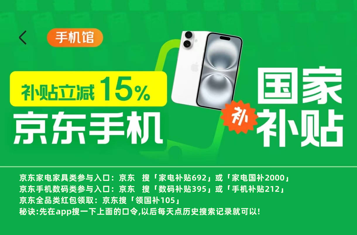 手机国补领取:京东APP搜「手机补贴800」或者「 手机补贴212 」最高补贴800元。电脑数码国补领取:京东APP搜「数码补贴395」或者「 数码补贴900」最高补贴2000元。