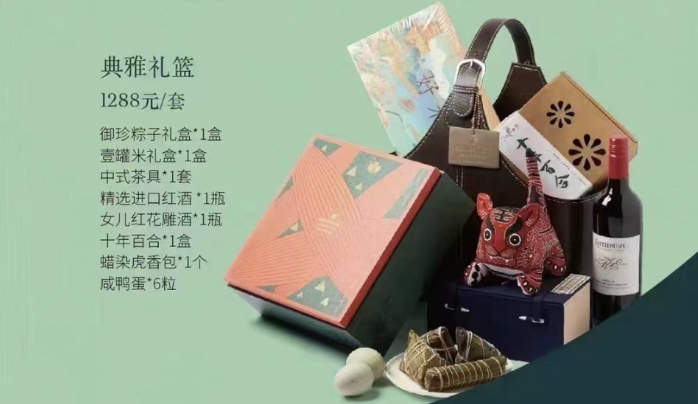位于北京市西城区的一家酒店近日推出了一套售价1288元的端午礼篮,除了一盒粽子外,还装有茶具、进口红酒、女儿红花雕酒等礼品。工作人员说,这款高档礼篮销量不错,“个人买得较少,主要买家是公司,为了送长期合作的客户、关系人”。