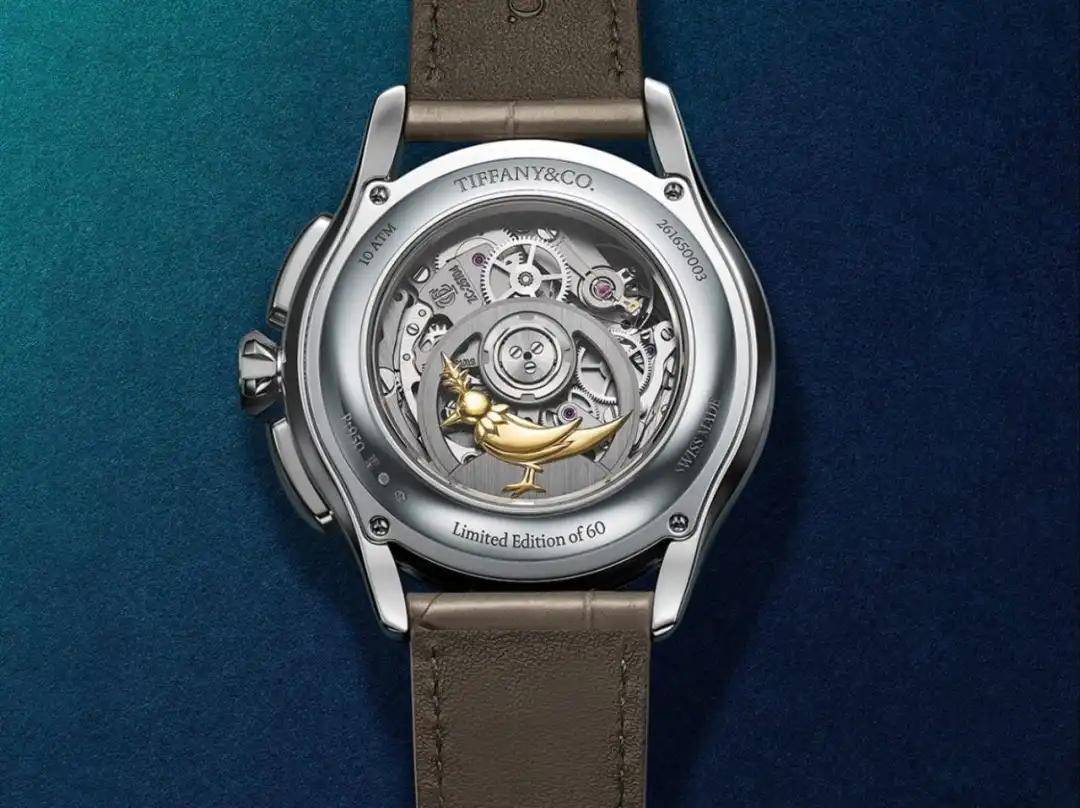 腕表采用了40毫米抛光铂金表壳,蒂芙尼蓝的漆面表盘上镶嵌了12个狭长形切割钻石时标,刻面表冠的设计灵感源自The Tiffany Setting六爪镶嵌钻戒,翻转腕表就会看到由一整块18K黄金手工雕琢而成的经典“石上鸟”图案的专属定制真力时El Primero 400机芯,也难怪有媒体将它比作“身着丝绸晚宴夹克的计时码表”。