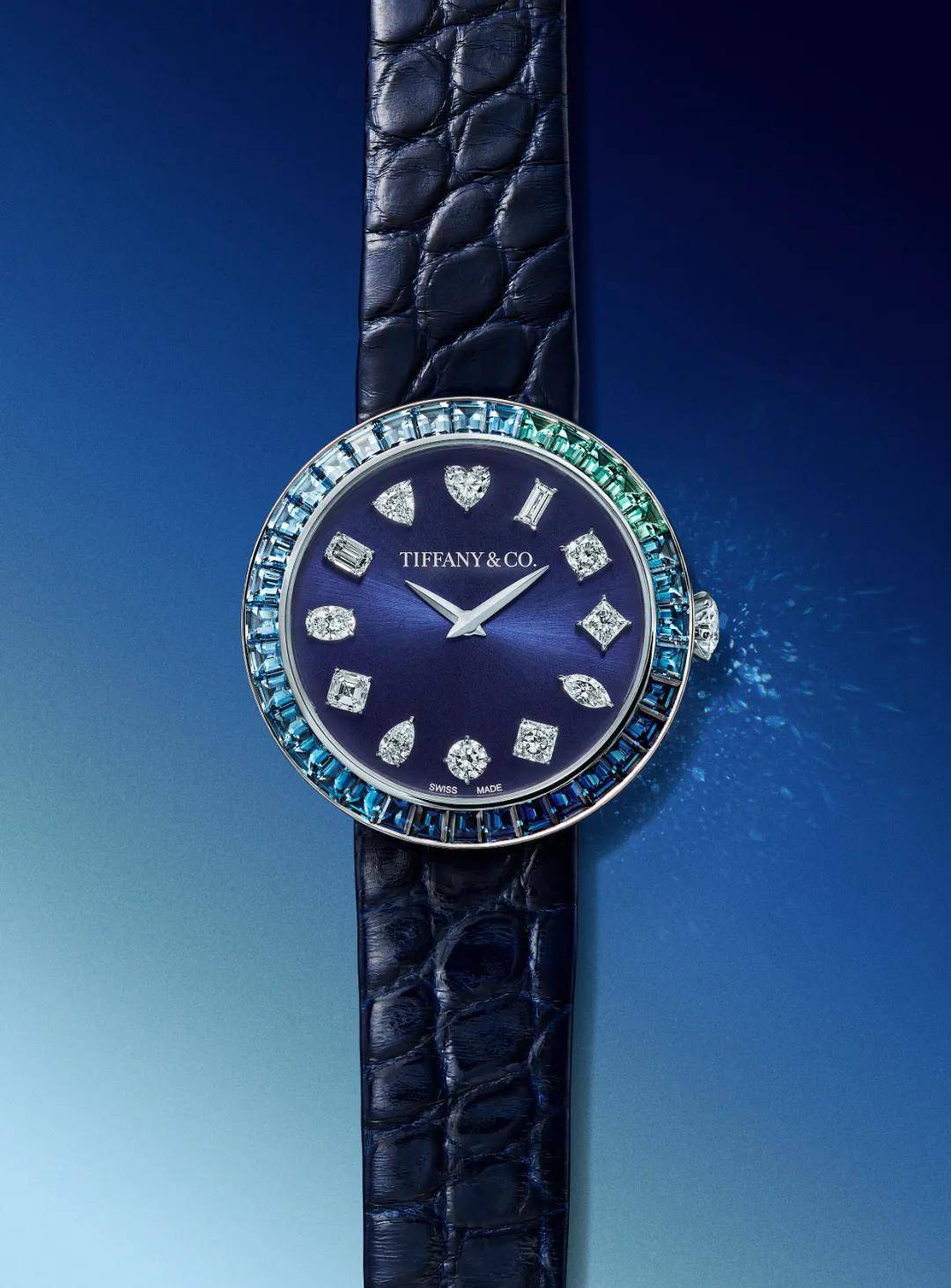 除了蒂芙尼蓝和石上鸟,这次的新作里又怎能没有蒂芙尼标识型的珠宝元素呢?来看看全新的Tiffany Eternity系列Baguette腕表!作品采用直径36毫米18K白金镶钻圆形表壳,并首次在表圈镶嵌了狭长形切割宝石,新品推出了两种款式——Eternity Baguette Diamond腕表和Eternity Baguette BlueGradient腕表,设计让人想到了海洋之心。