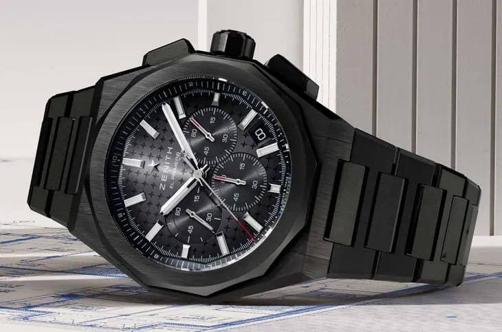 这次钟表周上,DEFY SKYLINE巅峰系列天际计时码表黑色款也在此闪耀登场,纯黑色调采用了整体着色工艺,渐变表盘从中心的较浅色调过渡到边缘的深邃色调,就像都市夜景一样。