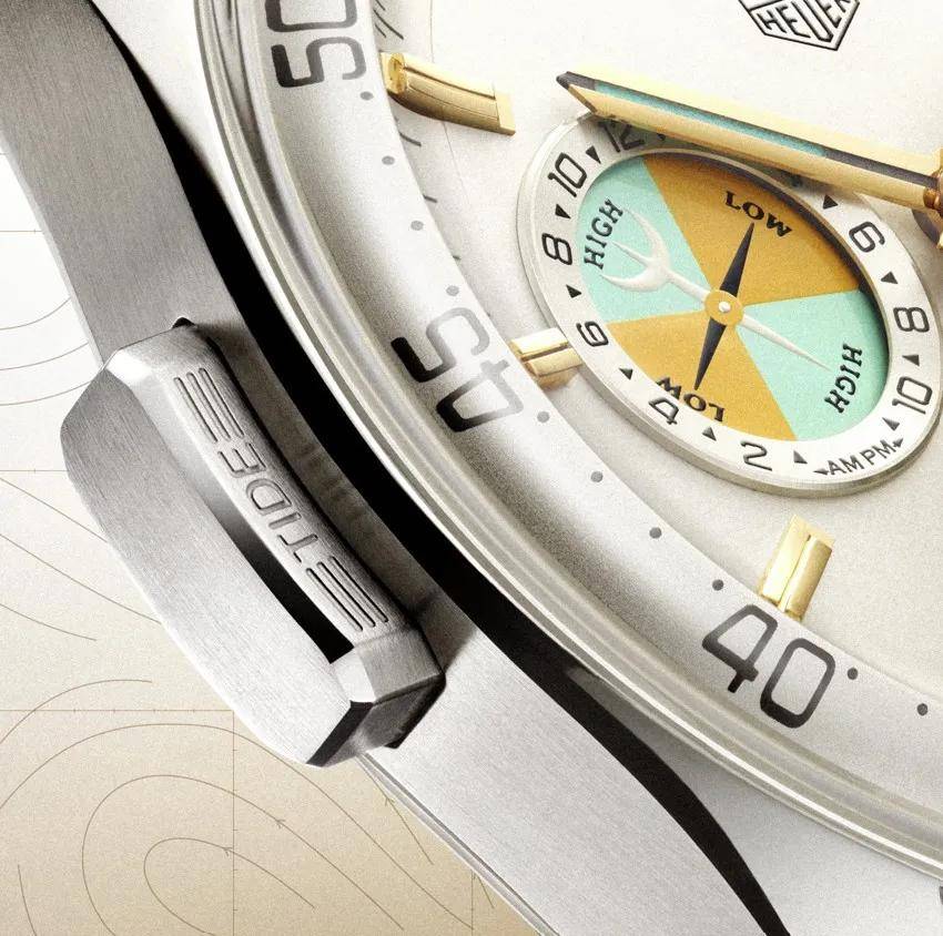 卡莱拉系列Seafarer计时码表的设计灵感,源自1949年问世的初代“Seafarer”潮汐腕表杰作,同样采用了标志性的Glassbox设计,特别的是表壳9点钟位置的“TIDE”潮汐指示按钮,使指针精准旋转在潮汐指示盘上,能够直观看到潮汐变化。
