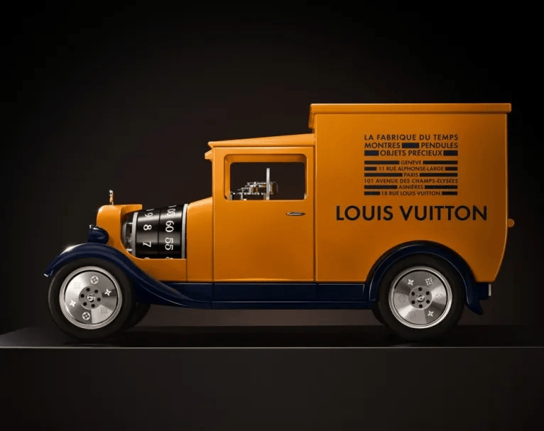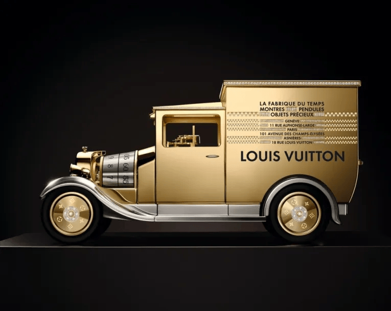 当然,最有看点的带有品牌旅行和风格的创意之作,还得是以路易威登传奇运输车为灵感打造出的Camionnette座钟,奢华版采用金色金属打造,引擎盖上镶嵌一颗0.5克拉的LV Monogram星形切割钻石,轮毂上的Monogram图案和头灯同样镶嵌了钻石,尾灯也由20颗长方形切割红色和橙色蓝宝石组成,不愧是“奢华版”。