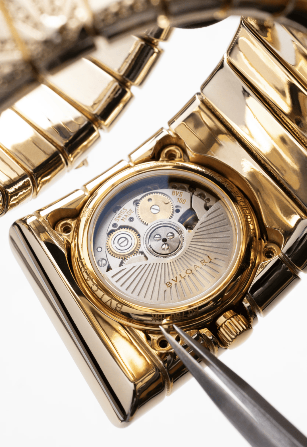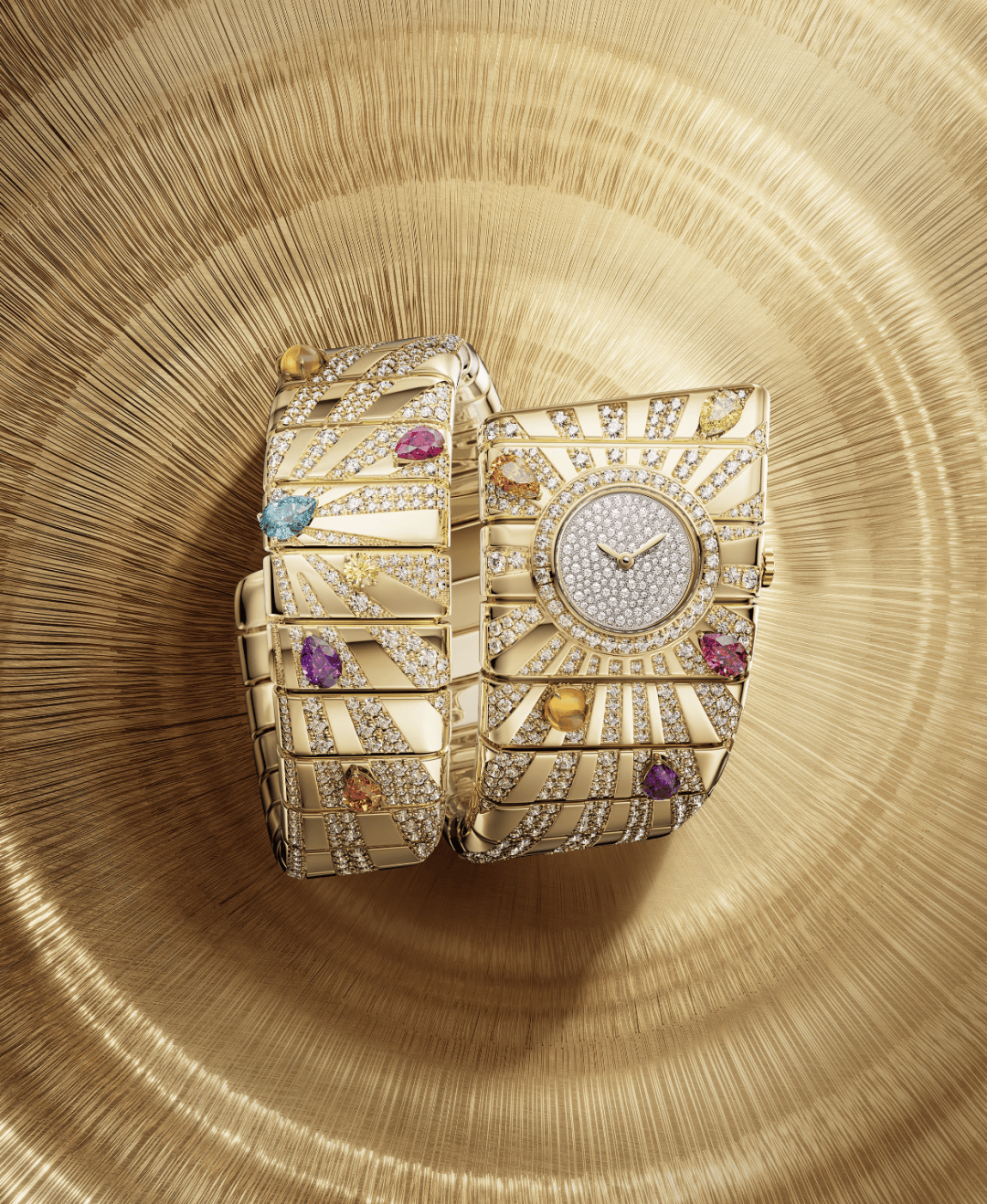 更加华丽的作品来源于这几款珠宝表,Tubogas Manchette 手镯式腕表复刻1974年品牌档案中的经典设计,展现1970年代的意式风情,特别是18K黄金宽幅的单圈表镯上镶嵌了近12克拉钻石及黄水晶、红碧玺等彩色宝石,闪耀夺目。