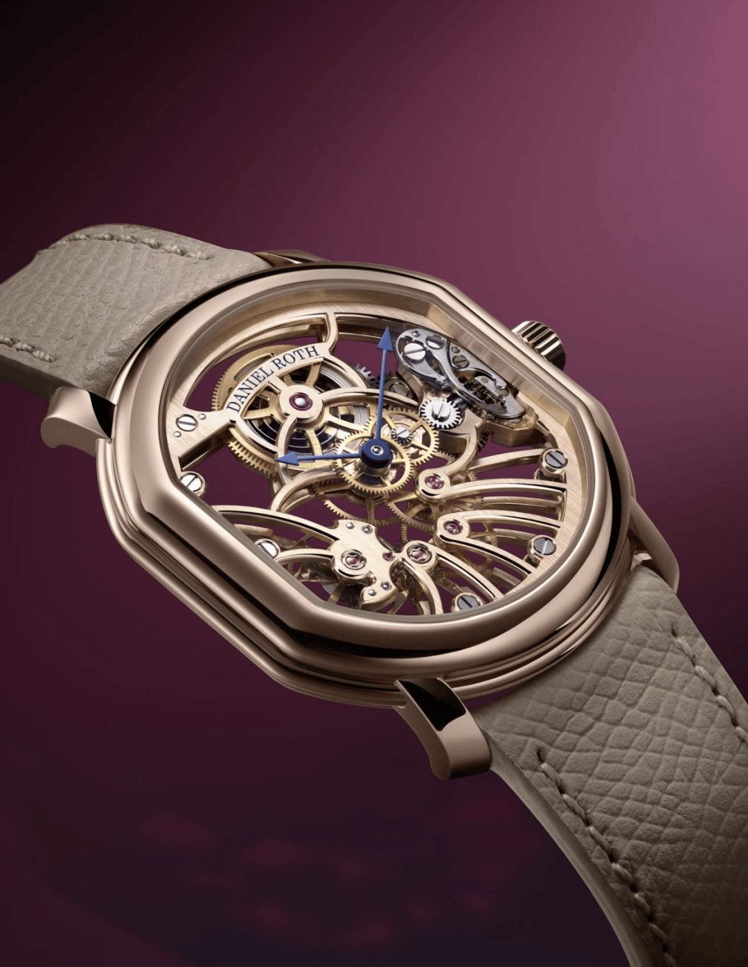 Daniel Roth 丹尼尔·罗斯复兴后的首款原创作品Extra Plat Rose Gold Skeleton 镂空超薄腕表闪耀亮相,厚度仅仅6.9毫米,简约的设计内里却大有乾坤。