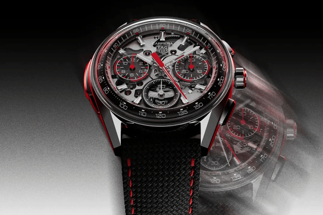 这款作品最核心的双秒追针计时功能,意味着它能够进行分段计时、恢复同步计时及同时归零,整表采用5级钛金属打造,延续了近年来卡莱拉系列标志性的 “Glassbox”设计,机芯摆陀采用了泰格豪雅经典盾形品牌标识的造型,更在表背的特殊设计下,形成了独特的悬浮效果,腕表前后的视觉效果都拉满了。