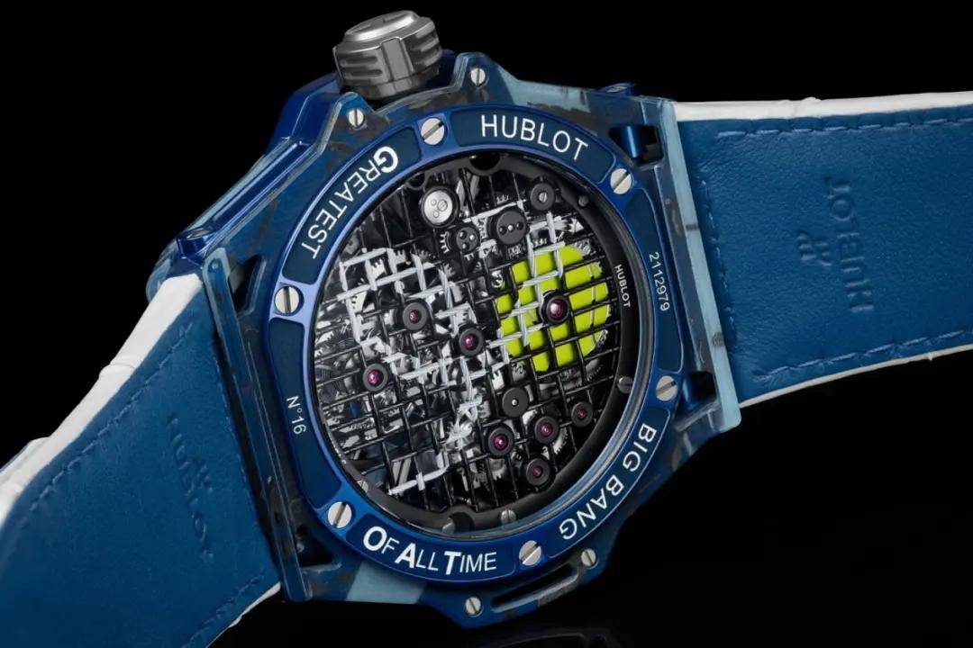 除此之外携手英国设计师SAMUEL ROSS 塞缪尔·罗斯打造的Big Bang Unico SR_A,是首款搭载宇舶自产Unico机芯的SR_A联名款,采用了单色陶瓷外观,外观重点在于搭配了全新研发的蜂窝橡胶表带,通过简化视觉信息提升了轻盈感。