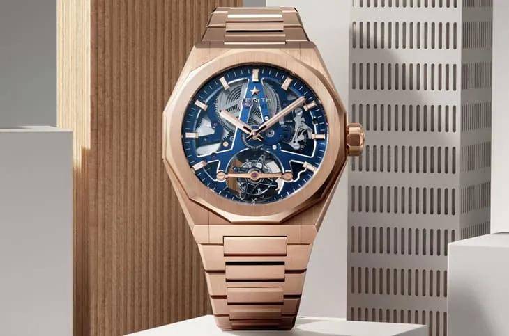 DEFY SKYLINE巅峰系列陀飞轮镂空天际腕表是此系列天际腕表中的首款陀飞轮镂空腕表,通体采用玫瑰金材质打造,机芯从中心升起,周围环绕着承载时标的环形凸缘,ZENITH标志悬浮在蓝宝石水晶表镜之上,而标志性的星形图案则直接镶嵌在镂空主夹板上,采用的双层倾斜几何设计结构,更是营造出不断变幻的立体效果。
