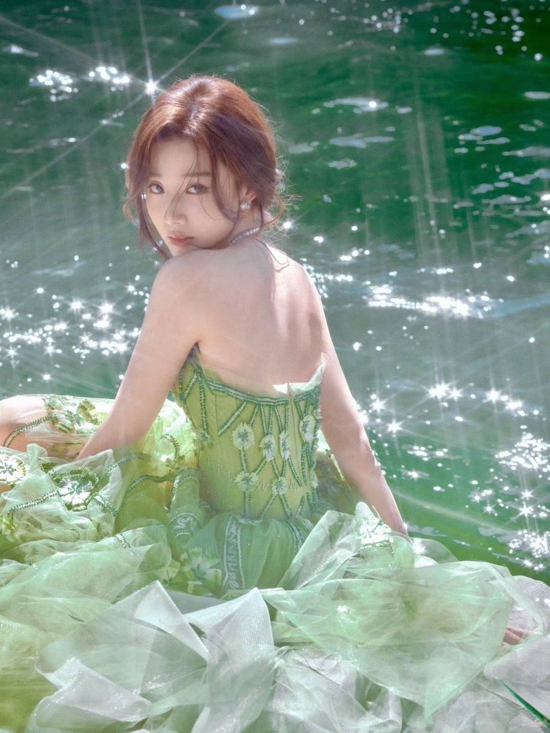 卢昱晓身着一袭浅绿色抹胸长裙缓步走来,仿佛将整个春天穿在了身上。清新的绿色调与现场绿植布景相得益彰,薄纱裙摆随风轻扬,裙身遍布立体花卉刺绣。抹胸设计完美展露出她修长的肩颈线条与精致锁骨,搭配多层珍珠项链与耳饰,温润光泽与冷调肤色交织,营造出“清冷仙子”的绝美氛围。更令人惊艳的是,活动特别设置的溪边写真环节中,她赤足踏石,裙裾轻拂水面,光影交错间宛如从森林深处走出的精灵,美得不食人间烟火。