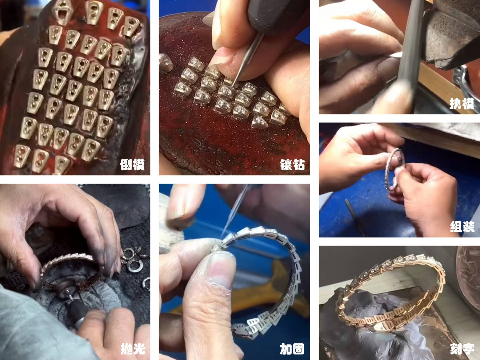 手镯在制作过程中,需要首先对每个骨节单独倒模,然后再逐一进行雕刻、镶钻、抛光等等,直至所有部件均完美呈现,最后通过内置的钢片巧妙地将它们串联组装。因其工艺复杂、工序繁多,蛇形手镯的制作周期往往要比普通珠宝更长一些。