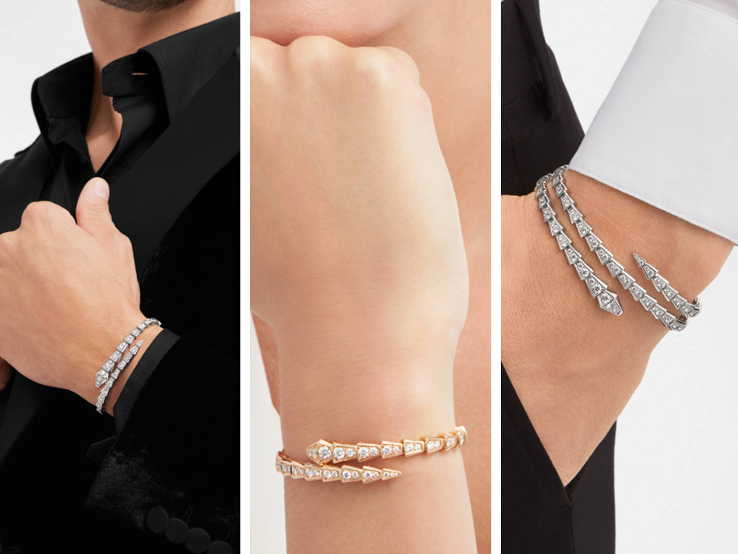 从设计层面上看,窄版手镯延续了强烈的蛇骨风,两端是抽象化的蛇头与蛇尾,中间部分均为标志性的梯形骨节。根据圈口的不同,手镯设有30余节,它们环环相扣、紧紧相连,组合在一起宛如灵蛇的身体,蜿蜒盘桓在手腕之上。