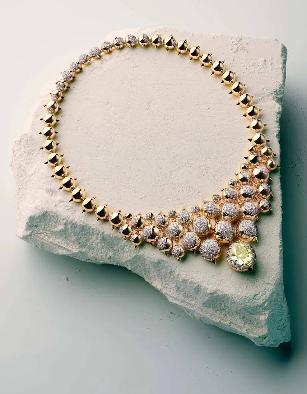 这条项链由18K金精心打造,中央镶嵌的是一颗重达15.59克拉的椭圆形彩黄钻,周围环绕1,078颗圆形白钻,总重18.32克拉。整体设计犹如运动中的光影交织,完美地平衡了璀璨的闪耀与流动的动感,第一眼和无数眼看过来,都会感叹它的美丽。