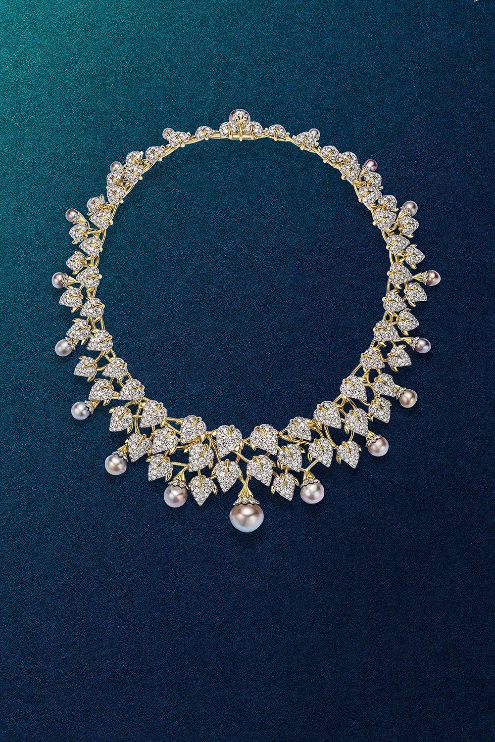这件作品以让·史隆伯杰的经典叶形项链为灵感,纤巧黄金“藤曼”与镶钻“叶片”相互交叠,与镶嵌于“枝叶”末端的天然野生珍珠一起随佩戴者轻盈律动。而其中的每一颗天然野生珍珠,皆源自该领域的世界权威阿法丹(AI Fardan)典藏,因卓越的光泽、色泽与形态而格外珍稀。