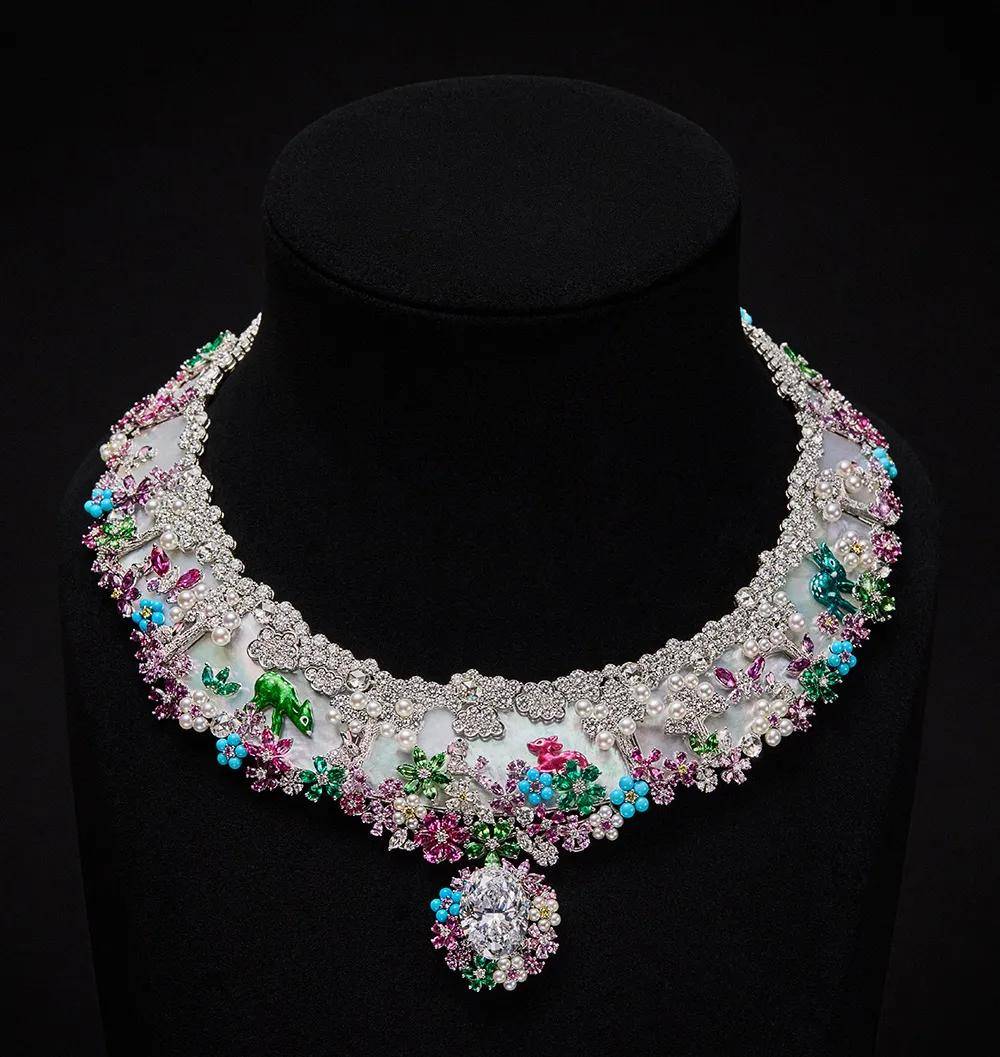 项链之上,一幅秘境般的自然画卷在流光溢彩的珍珠母贝上徐徐展开,珍奇花卉与灵动生灵相映成趣。底幕上流转的虹彩,恰如天边流转的云影光晕。