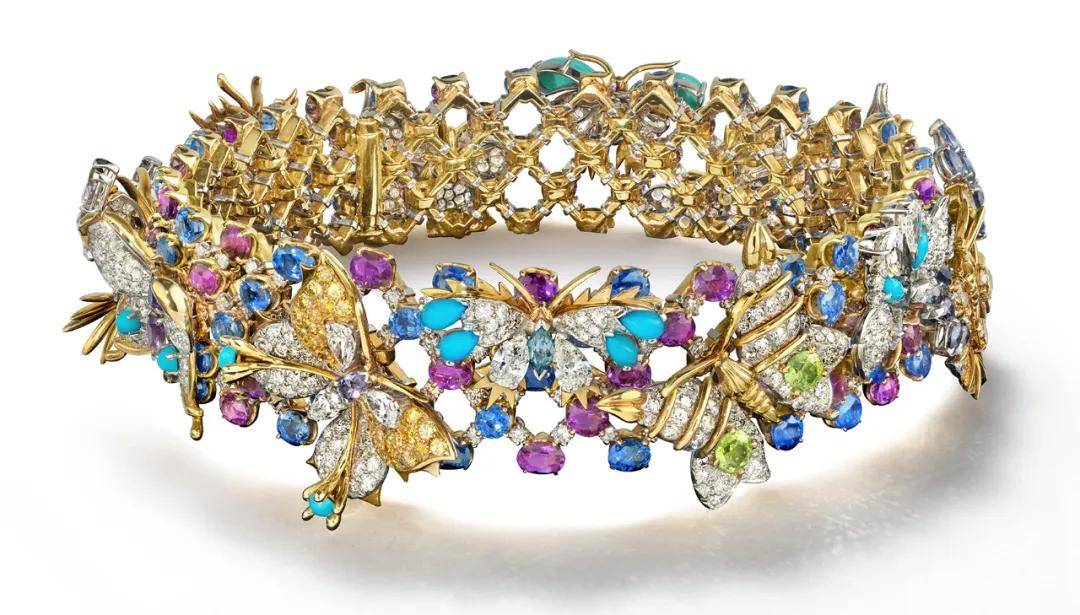同年,蒂芙尼纽约高级珠宝工坊的工匠们将这一构想化为现实。作品镶嵌钻石、绿松石、紫水晶、橄榄石、蓝宝石及尖晶石,每只蝴蝶皆经过精心排布,生动再现蝴蝶翩然欲飞的灵动姿态——这在当时是无模具、全手工的立体雕塑,今天看依旧是色彩与空间的超前实验。