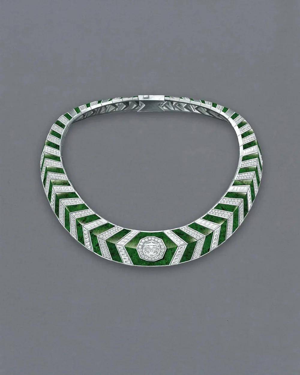 更妙的是它“一箱多用”的机械逻辑运用到了高级珠宝之上——通过隐藏铰链与快速释放扣,项链可以在单排带坠、无坠Y字、多排Ribbon三种形态间自由切换,而每一种都拥有强烈的建筑感与佩戴张力。