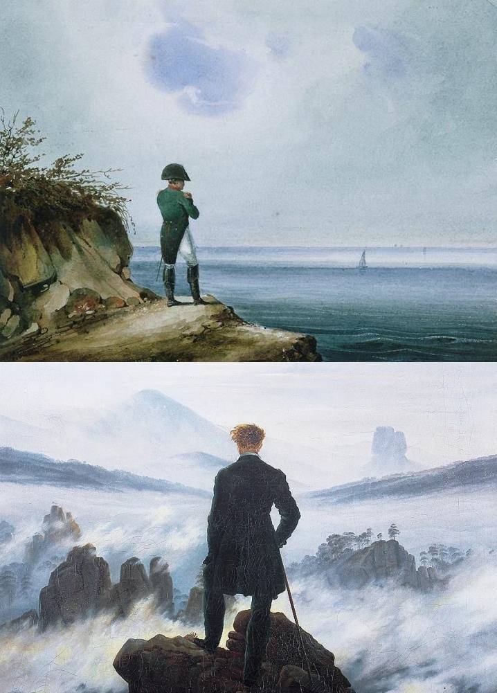 上:弗朗茨·桑德曼(Franz Josef Sandmann)《拿破仑在圣赫勒拿岛上》,1820年;弗里德里希《雾海上的旅人》,1818年,德国汉堡美术馆 藏