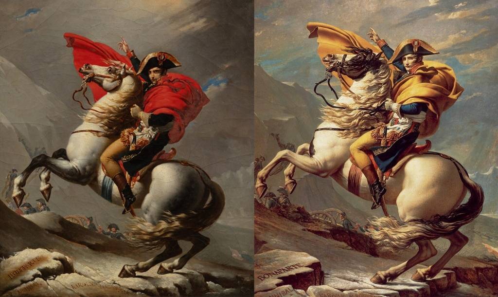左:莫塞思《拿破仑翻阅阿尔卑斯山》,1807年,2025年在巴黎苏富比以原估值20倍的价格售出 图:Sotheby’s;右:雅克-路易•大卫《拿破仑翻阅阿尔卑斯山》,1801年,卢浮宫 藏