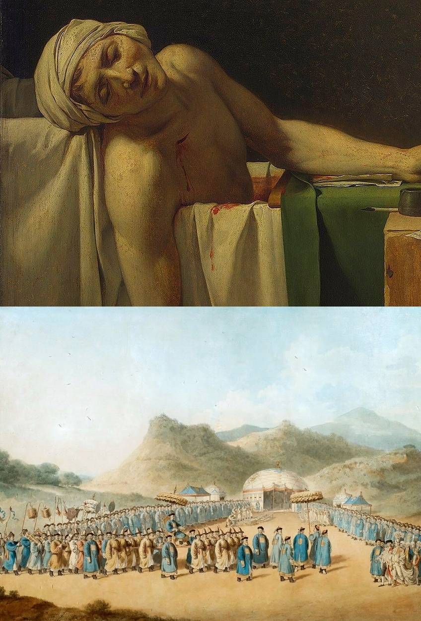 描绘1793年历史的两幅画作 上:大卫《马拉之死》(局部);下:威廉·亚历山大《清乾隆帝接见英国马嘎尔尼使团》
