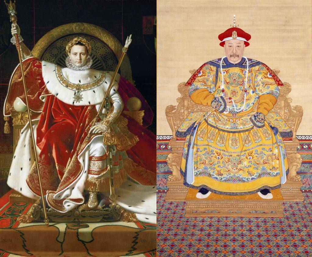 拿破仑时代正值清朝嘉庆年间 左:安格尔《王座上的拿破仑一世》,1806年,巴黎军事博物馆 藏;右:清 佚名 《清仁宗嘉庆皇帝朝服像》 故宫博物院 藏