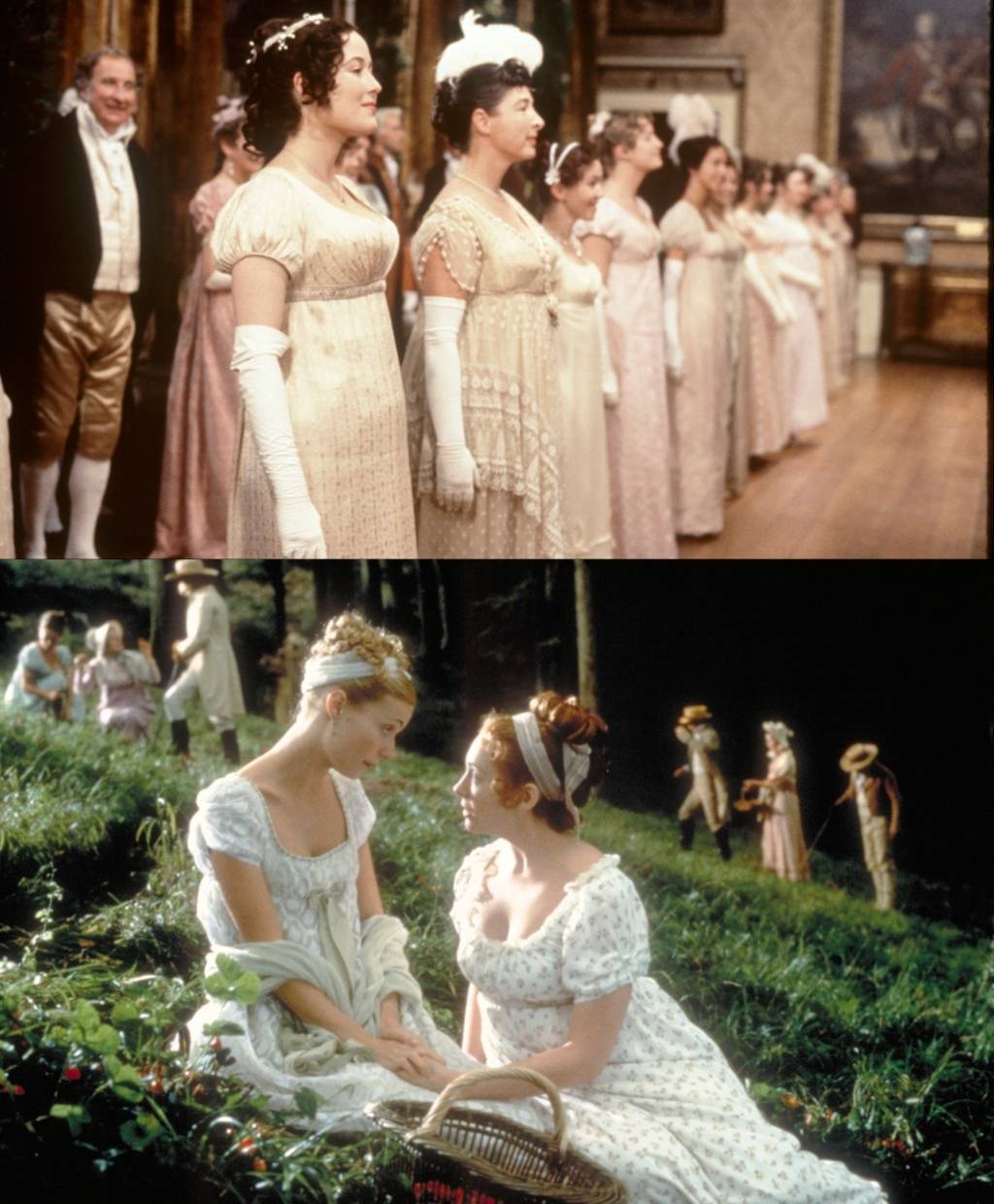 简•奥斯丁是拿破仑时代的英国作家,帝政风格是小说人物形象。上:1995年英剧《傲慢与偏见》;下:1996年电影《艾玛》剧照