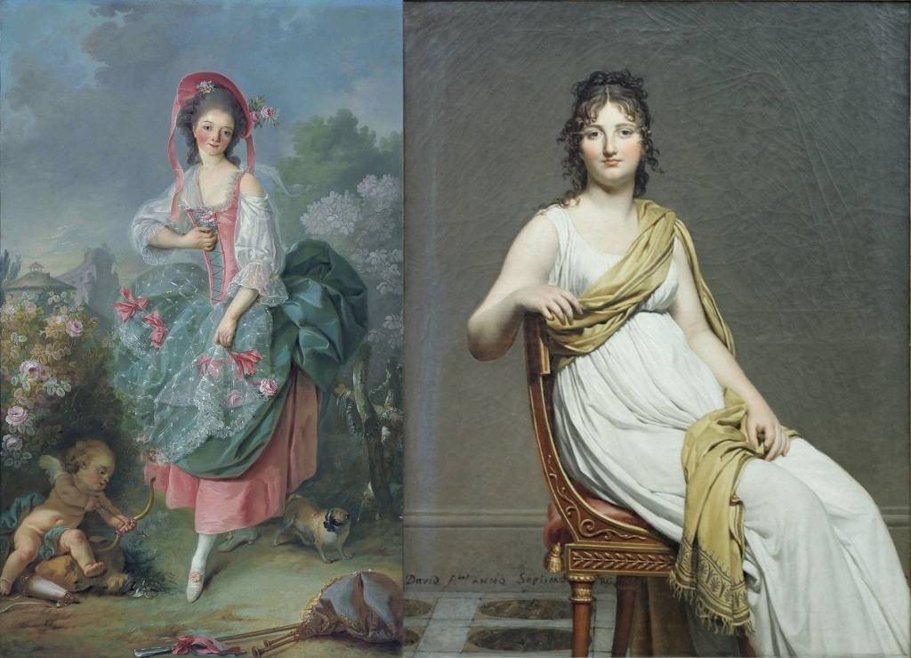 雅克-路易•大卫在波旁王朝和拿破仑王朝的女性人物风格也形成对比。18世纪七十年代,画作是清淡鲜明的颜色和精致曲线构图,花园中的俏皮女性在基路伯小天使和爱情神话中舞蹈。到拿破仑时期,女性只留简洁的白色希腊式长裙和流畅披肩,大胆露出双臂,神色从容。