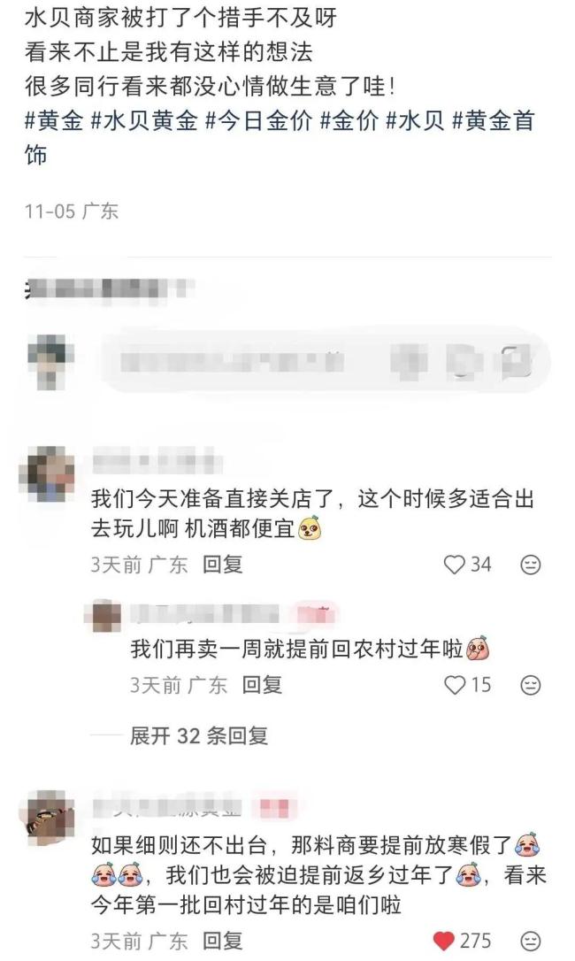 这一现象很快引发网友热议,“今年最早一批回家过年的竟然是水贝商家”的调侃在社交平台广泛传播。有网友留言:“以前觉得黄金是硬通货,没想到政策变动影响这么大”,也有网友表示理解:“成本涨了生意难做,暂时离场也是明智之举”。
