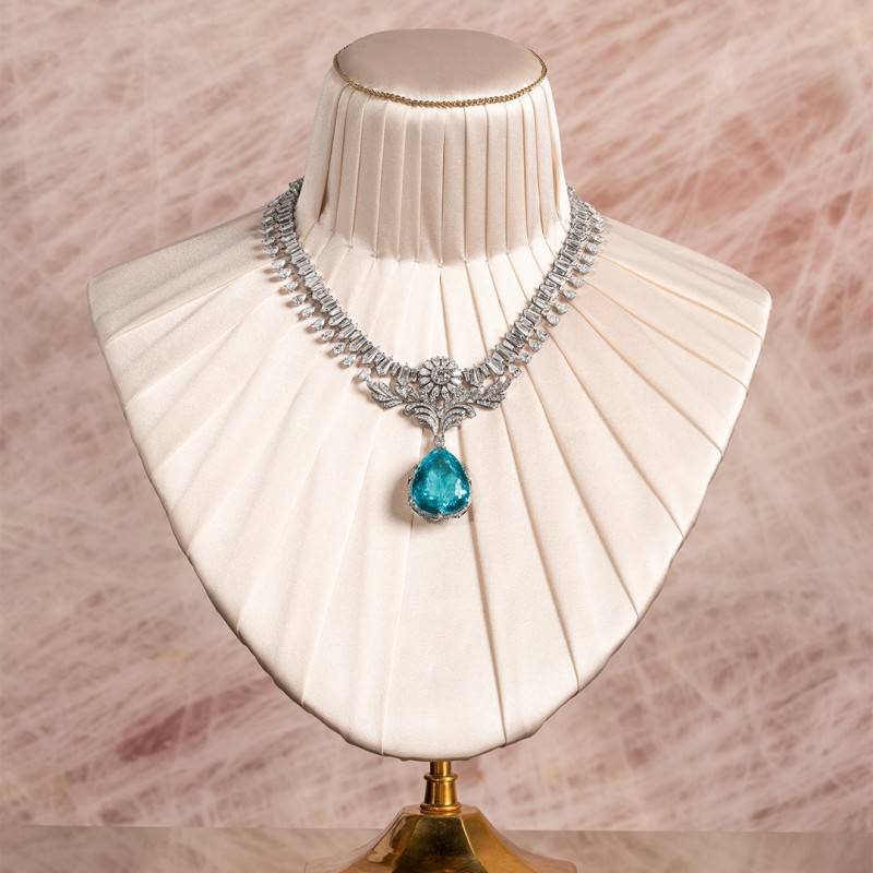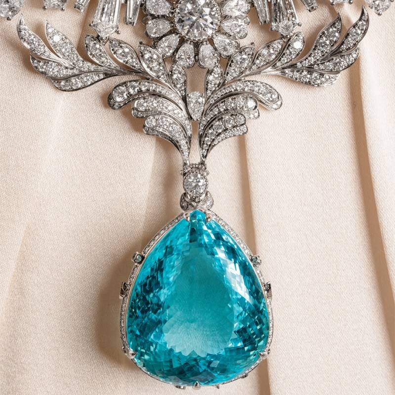为整体造型画龙点睛的是一条杜嘉班纳高级珠宝白K金项链,镶嵌着一颗来自莫桑比克、重达74.459克拉的帕拉伊巴碧玺,这颗宝石被命名为“Oceanina”(海洋女神),周围环绕着闪耀的钻石。同时,她还佩戴了同系列白K金钻石耳环,与项链交相辉映。这一造型完美地诠释了杜嘉班纳美学中创造力、工艺与精致感的和谐统一。