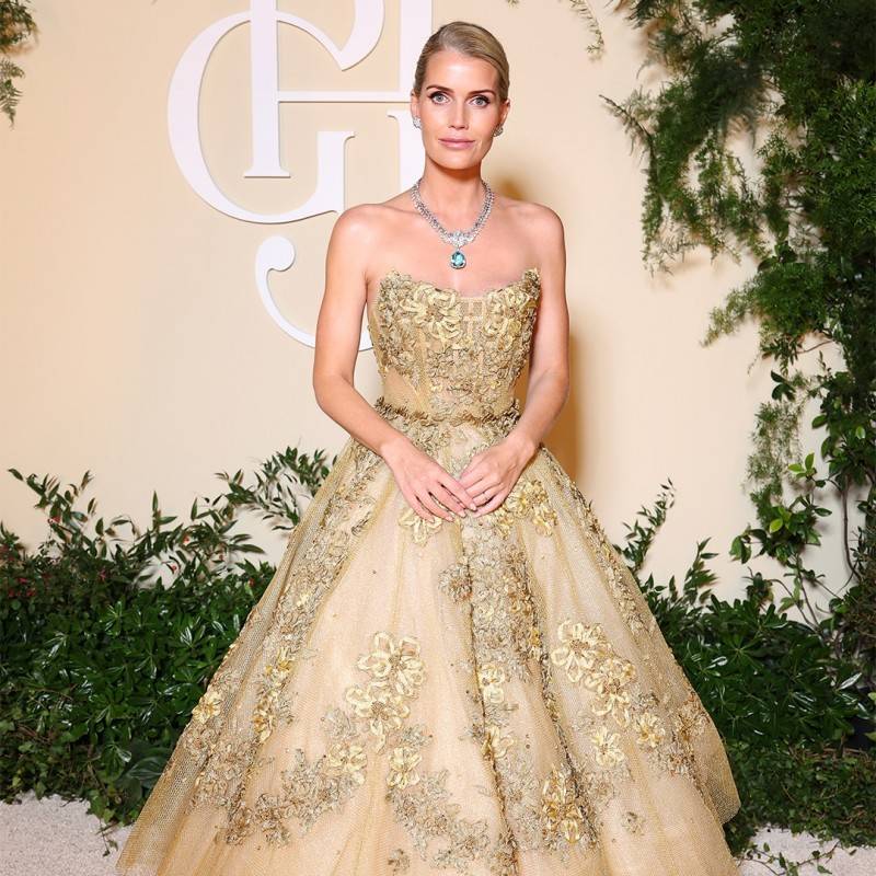 凯蒂·斯宾塞女士(Lady Kitty Spencer)作为品牌代表出席颁奖典礼并领奖。她身着杜嘉班纳高级定制(Alta Moda)紧身长裙,裙身采用透视薄纱、金银丝薄纱与金银丝网眼面料制成,并饰有金银丝带与水晶刺绣,尽显高贵典雅。Dolce&Gabbana这条长裙出自2025罗马系列,与高级珠宝相得益彰。
