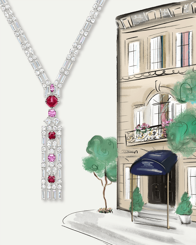 纽约上西城的赤褐色砂石建筑,是温斯顿先生童年的温暖底色。Brownstone子系列萃取建筑的几何轮廓精髓,以多种切工钻石搭配方形彩色宝石有序排列,精妙复刻褐石建筑的典雅韵味。其中红宝石配粉色蓝宝石套装的色彩组合,巧妙呼应建筑的温润肌理,让这份经典之美在珠宝中永恒留存。