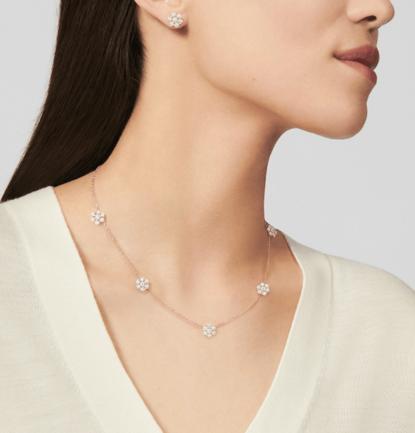 梵克雅宝的Fleurette项链就是一款钻石花环项链。这款钻石项链以七颗圆形钻石组成迷人的花冠,可以展现佩戴者的优雅气质。
