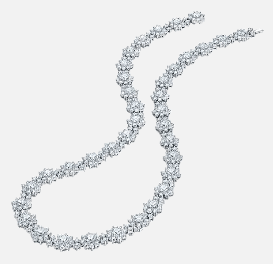 钻石花环项链以钻石镶嵌成花环或花朵图案的形式呈现,展现出一种柔美与浪漫的风格。这种款式的项链通常造型精致,充满艺术感,适合喜欢自然元素或花卉图案的女性。钻石花环项链可以是整条链子都镶满钻石,也可以是局部点缀。它的设计常常与女性的柔美气质相得益彰,是婚礼或庆典场合中的理想选择。